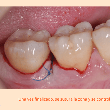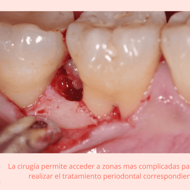 Procedimiento: Se realiza una incisión para levantar las encías, limpiar las raíces de los dientes y el hueso, y luego se suturan las encías en su lugar.