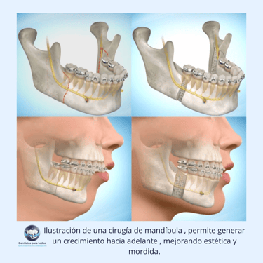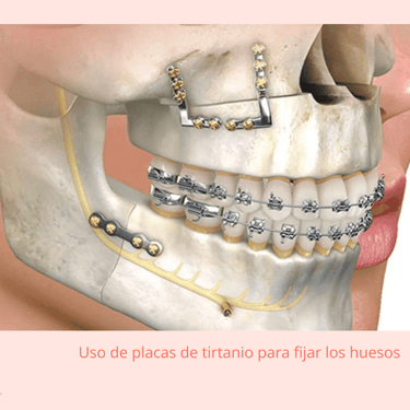 Cirugía: Realización de incisiones intraorales para acceder a los huesos mandibulares y maxilares, seguido de la corrección y fijación de los huesos en su nueva posición.