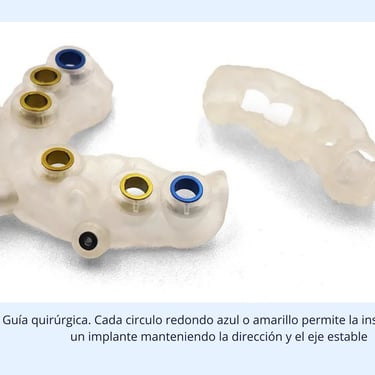 Importancia: Las guías quirúrgicas permiten una colocación precisa de los implantes dentales, mejorando la precisión y reduciendo el riesgo de complicaciones. Se basan en imágenes tridimensionales y planificación digital.