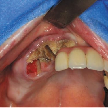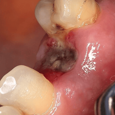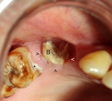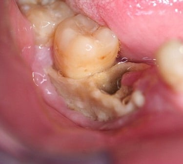 Los pacientes pueden notar dolor, hinchazón y exposición del hueso.