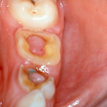 Los pacientes notan un tejido rojo que sobresale de la cavidad dental.