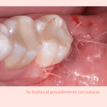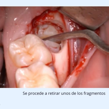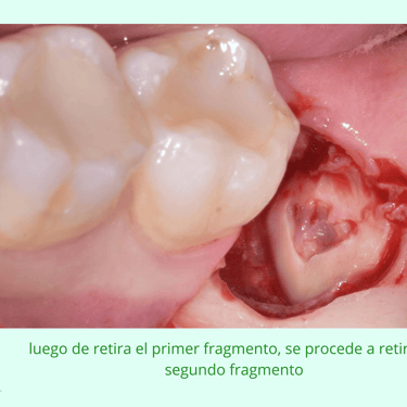 Extracción: Realización de una incisión en la encía para exponer el diente, seguido de la extracción del diente en una sola pieza o en fragmentos si es necesario.