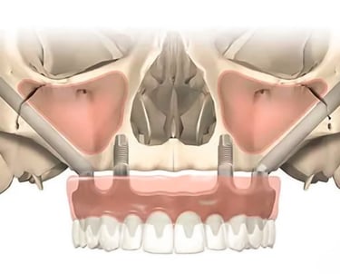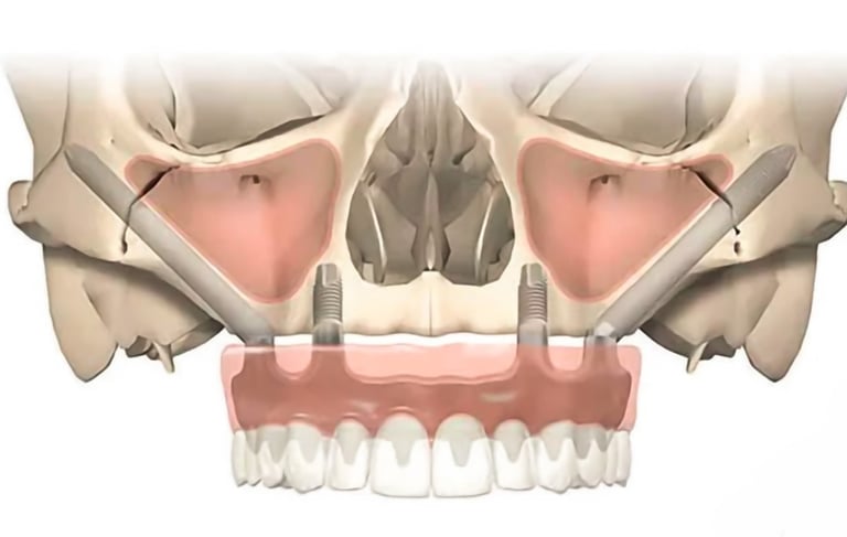 Son implantes largos que se anclan en el hueso cigomático (pómulo) en lugar del maxilar, utilizados en pacientes con severa pérdida ósea en la mandíbula superior.