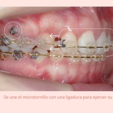 Conexión a los Aparatos Ortodónticos: El mini tornillo se conecta a los brackets, alambres o elásticos según sea necesario para aplicar las fuerzas ortodónticas planificadas.
