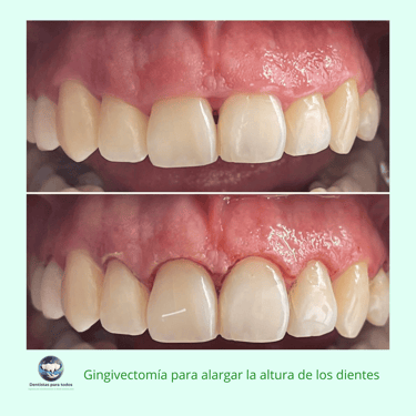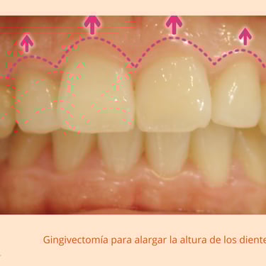 Riesgos y fallas: Riesgo bajo de infección o sangrado. En casos raros, el recontorneado excesivo de las encías puede hacer que los dientes se vean demasiado largos o causar sensibilidad dental temporal.