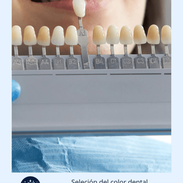 Evaluación Estética: Examen clínico de la mordida y la estructura facial del paciente. Discusión con el paciente sobre sus preferencias de tamaño y color. Selección de dientes que coincidan con el color, forma y tamaño de los dientes naturales del paciente.