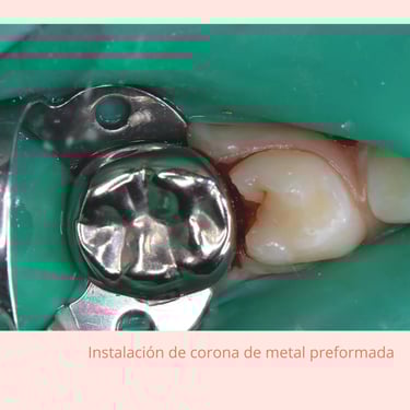 Restauración: Colocación de un material de relleno y una corona de acero inoxidable si es necesario.